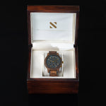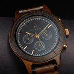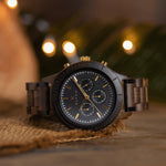 Dial : A highly textured Chronograph black dial, with golden hour and minute hands, golden second hands, black butterfly lock, and ebony natural grain wood case and band.