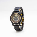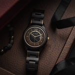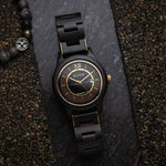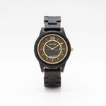 Dial: Black dial, with gold alloy case, black ebony wood plus gold steel band, stainless steel case back, and gold crown. Apart from this, it has gold silk printed hour marks, a silver butterfly lock and a black natural grain wood case and band, gold minute and hour hands and 2 chronographs for date & seconds.