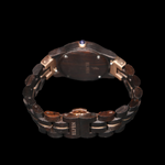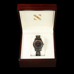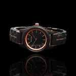 Dial: Black dial, with gold alloy case, black ebony wood plus gold steel band, stainless steel case back, and gold crown. Apart from this, it has gold silk printed hour marks, a silver butterfly lock and a black natural grain wood case and band, gold minute and hour hands and 2 chronographs for date & seconds