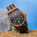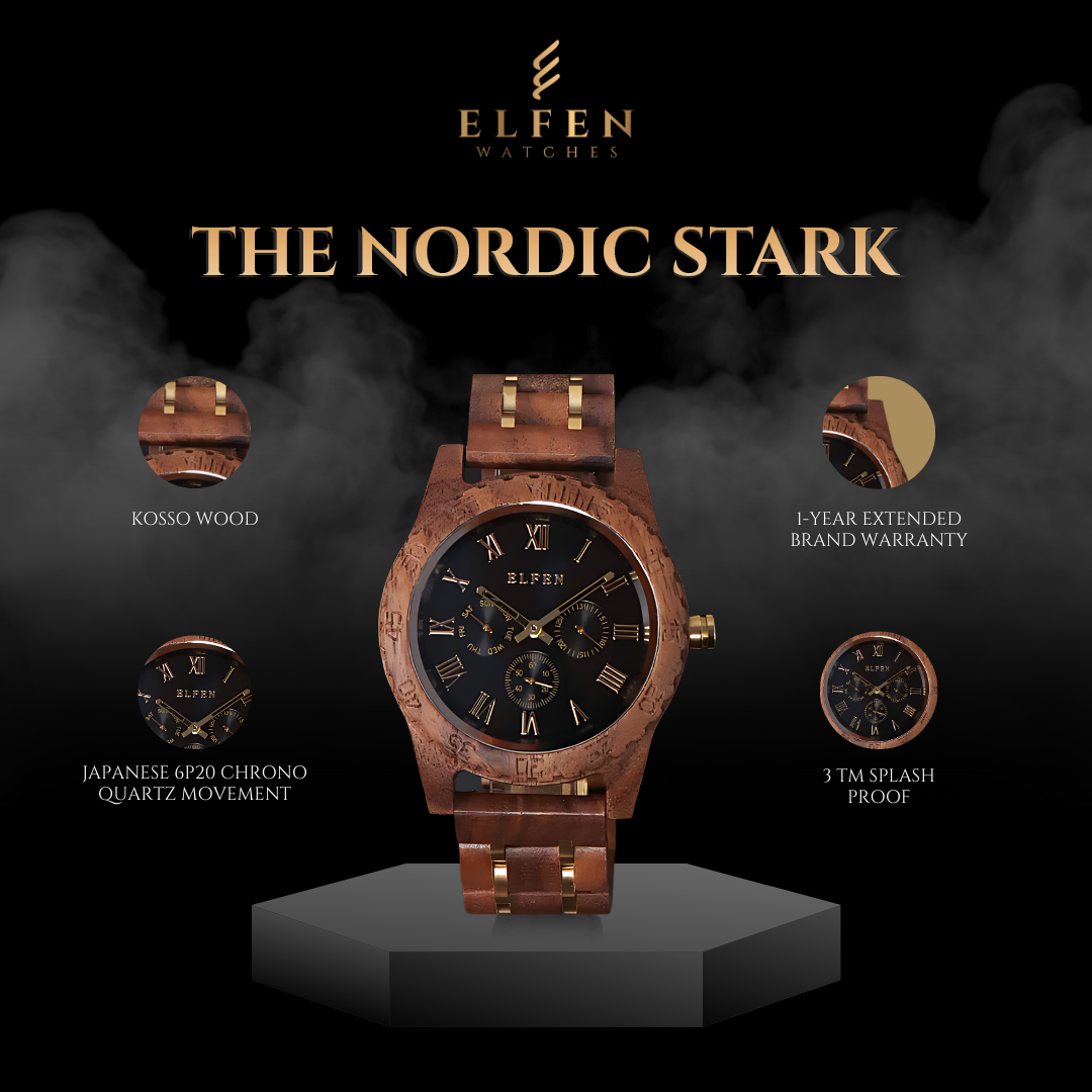 THIS MODEL: Celebrating the spirit of travel, we present to you our signature model "The Nordic Stark", which is built by finely sharpening the edges of the 2 rare woods ( Ebony & Zebra Wood ), giving it a caramel texture and at the same time a dark wood charisma. The golden hands and golden band rings of this watch gives it a rich raisin color. Its a "SPECIAL EDITION" watch hence limited in supply.