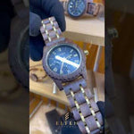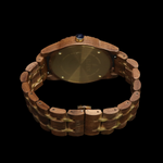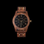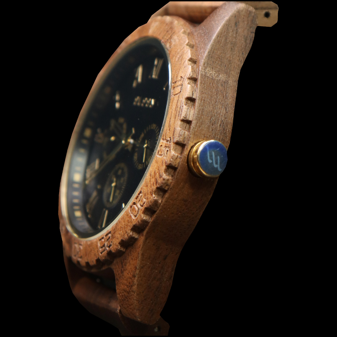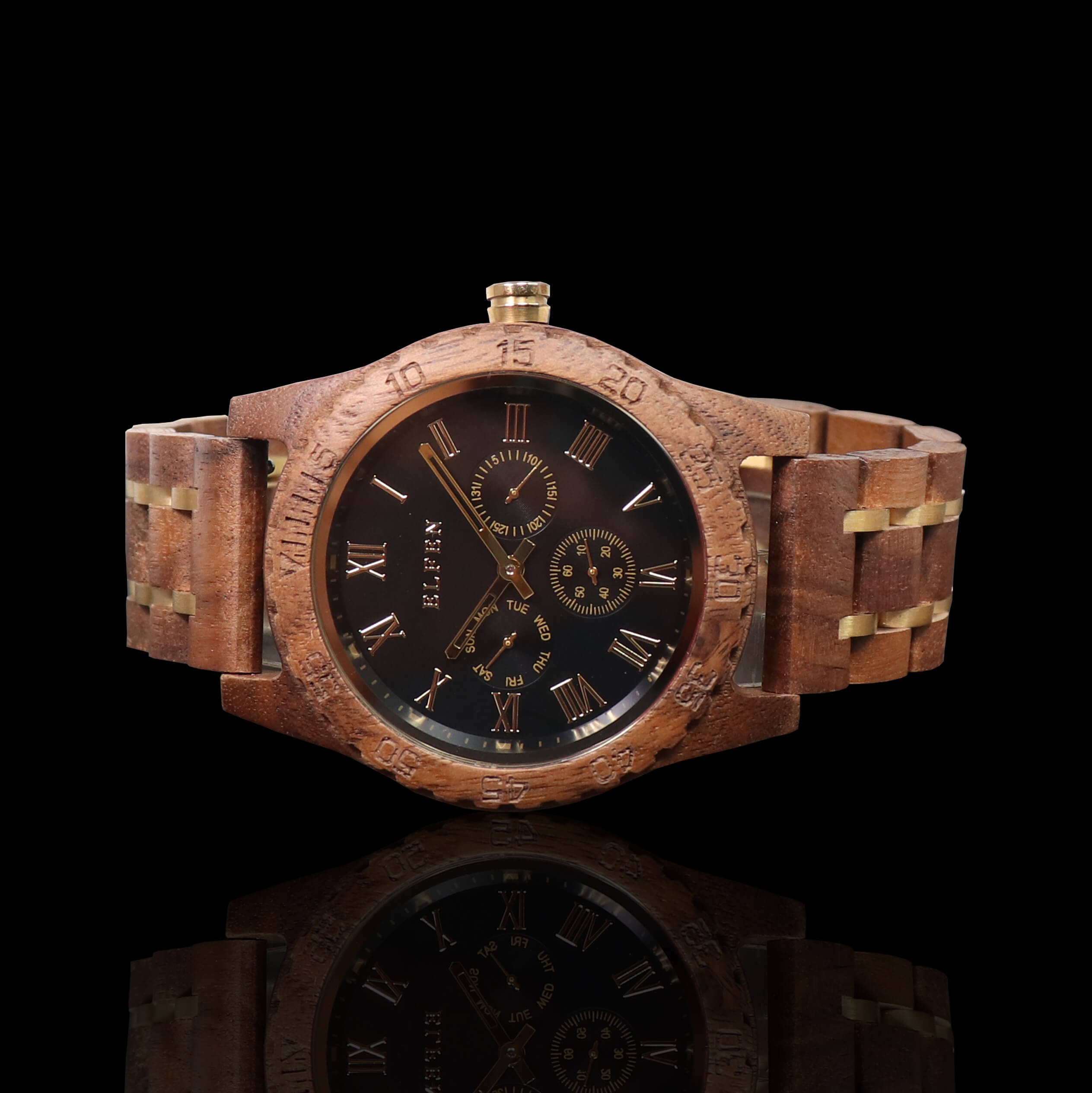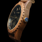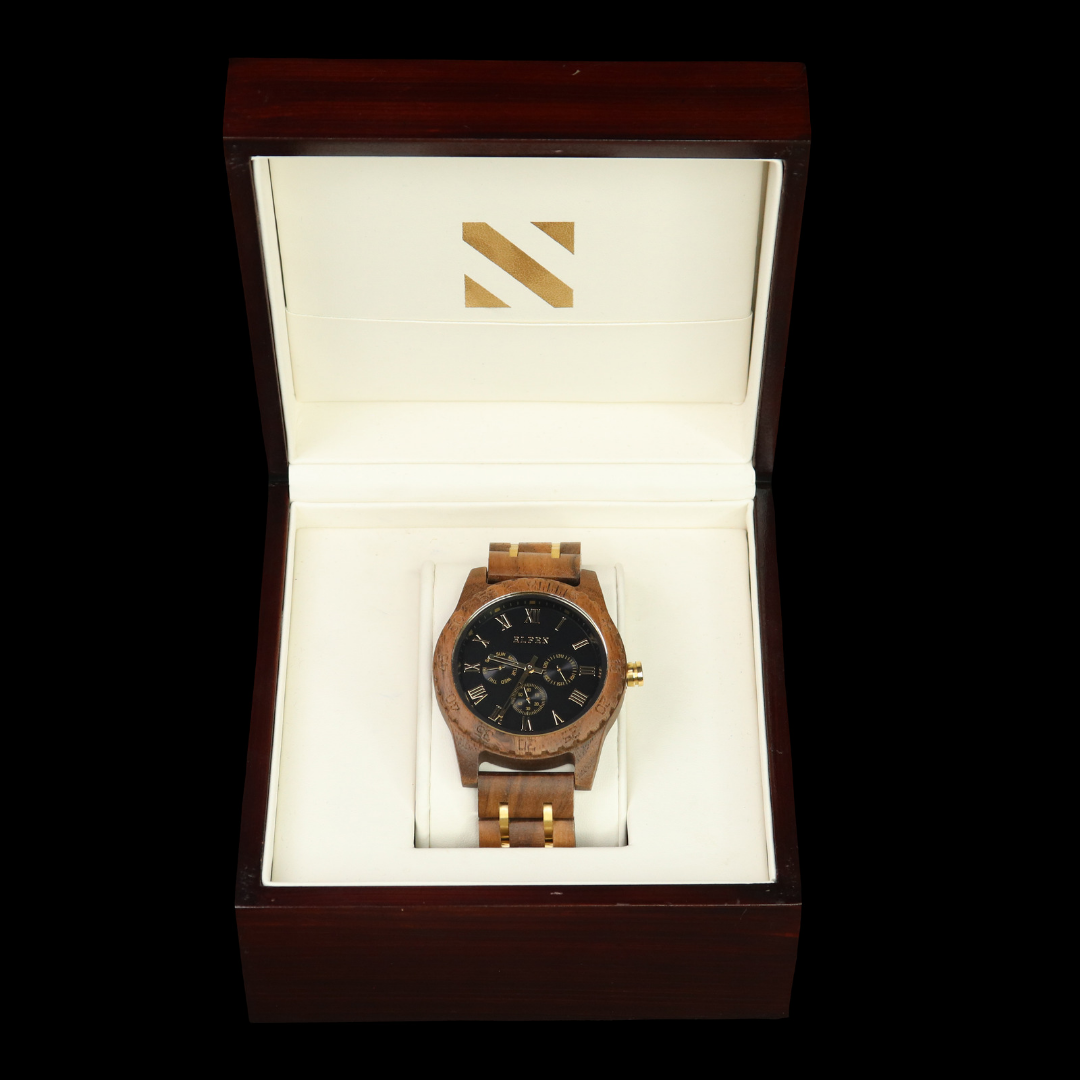 Dial: Black dial, with gold alloy case, black ebony wood plus gold steel band, stainless steel case back, and gold crown. Apart from this, it has gold silk printed hour marks, a silver butterfly lock and a black natural grain wood case and band, gold minute and hour hands and 2 chronographs for date & seconds.