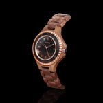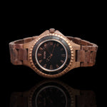 Dial: Black dial, with gold alloy case, black ebony wood plus gold steel band, stainless steel case back, and gold crown. Apart from this, it has gold silk printed hour marks, a silver butterfly lock and a black natural grain wood case and band, gold minute and hour hands and 2 chronographs for date & seconds.