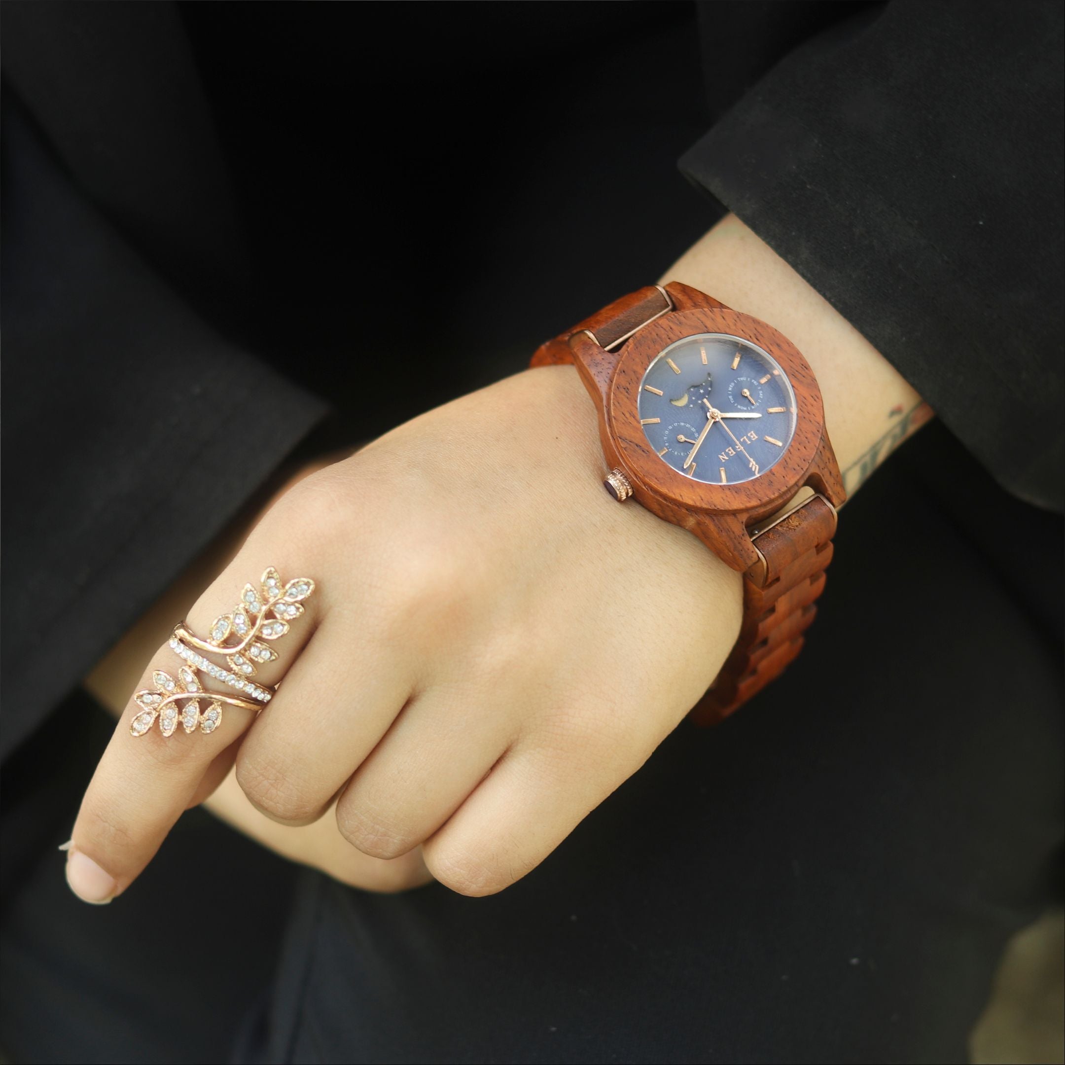 Unlike the popular opinion, wooden watches feel really light weight on your wrist. All of the watches from Elfen weigh less than 80 grams, and you can easily walk around without feeling anything on your wrist.